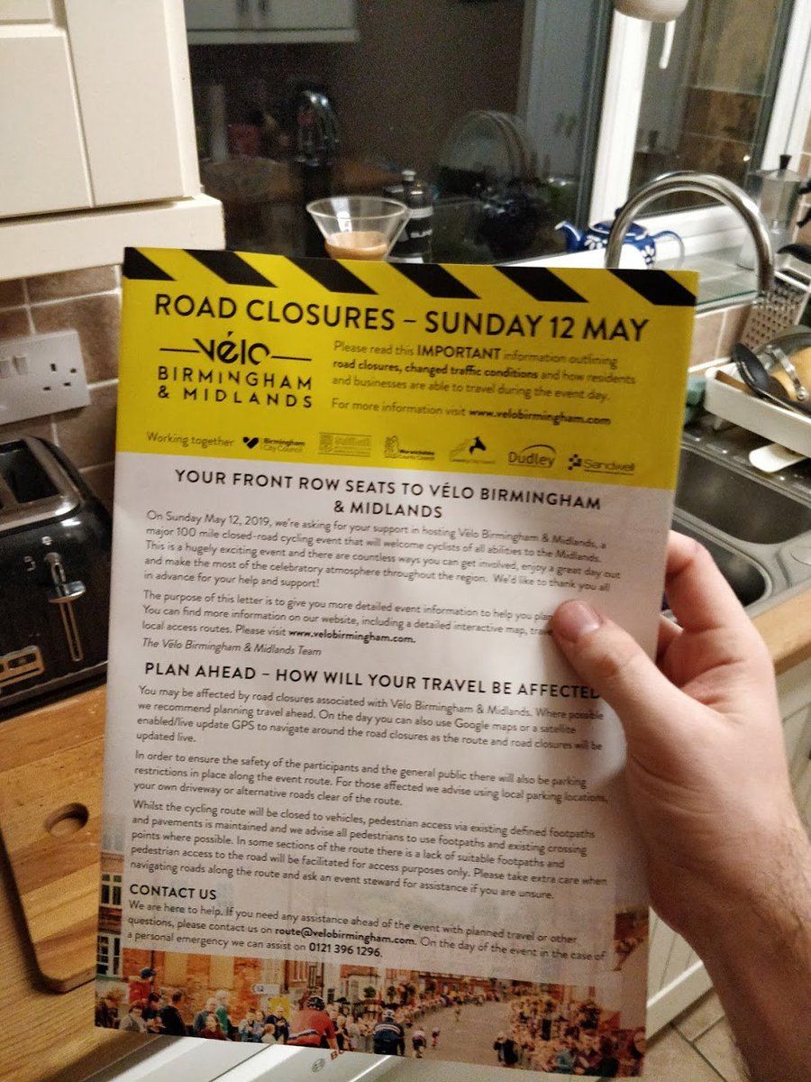 Got this in the post yesterday: four pages of A4 showing route and info about @VeloBirmingham, five months before the event. Guarantee next year that people will moan they weren't informed/told about it in advance, though.