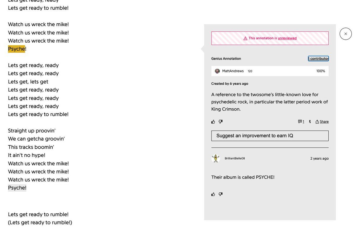 Every now and again I remember that I added a bunch of annotations to PJ & Duncan's "Let’s Get Ready to Rhumble" page on Genius and marvel at the lengths I'll go to when procrastinating
