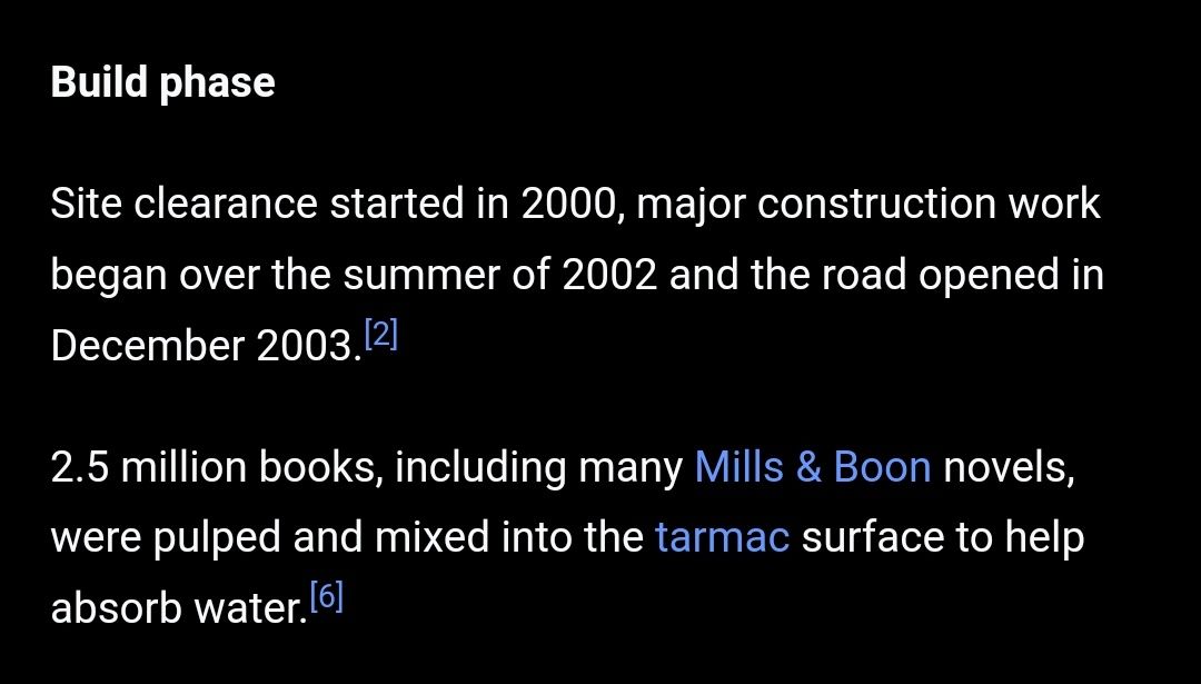 Drove on the M6 Toll Road this weekend and because I'm a massive nerd I'm reading its Wikipedia page. Did... did everybody else already know that the road was partially built on discarded Mills & Boon novels?
