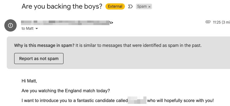 It's bad enough that recruiters are using the football to theme their junk emails, but the wording of this one really needs some work