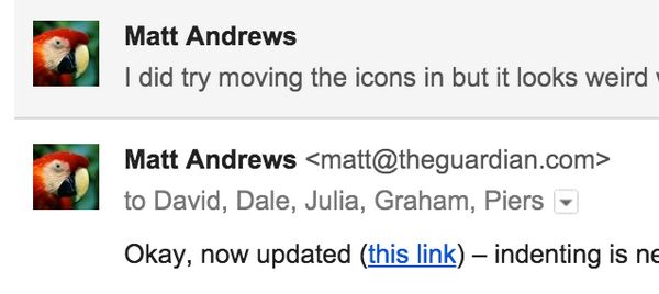 Keep forgetting Gmail has somehow changed my work avatar to a parrot. Nobody I've emailed has mentioned it.