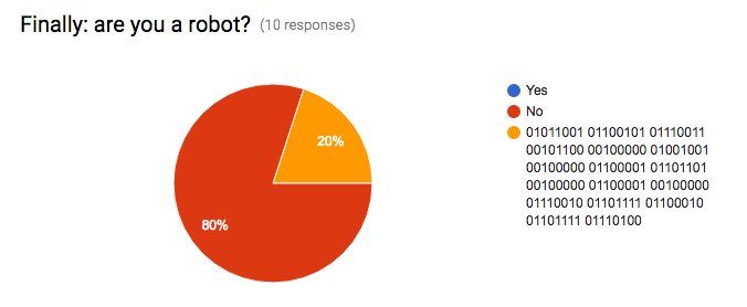 Ran a survey on people testing my Facebook chatbot. Included this final question: "Are you a robot?". Nobody was brave enough to vote yes.