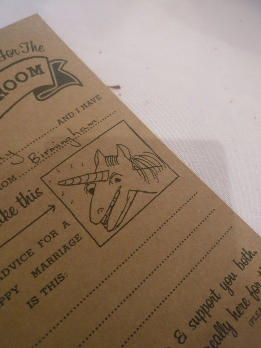 So at a wedding we went to, @maddymcgarrie had to draw a self-portrait on a little card on each person's seat. She tried to draw a unicorn: